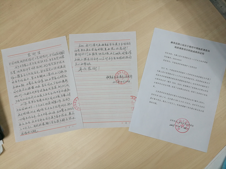 當(dāng)?shù)卣謩e給實(shí)施該項(xiàng)目的中國(guó)地質(zhì)調(diào)查局、中國(guó)地質(zhì)科學(xué)院探礦工藝研究所以及我院授予錦旗,并親筆手寫(xiě)感謝信,感謝項(xiàng)目組在脫貧地區(qū)開(kāi)展水文地質(zhì)調(diào)查和施工探采結(jié)合井工作,以及對(duì)地方老百姓的熱切關(guān)心和幫助。
