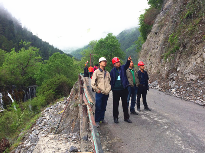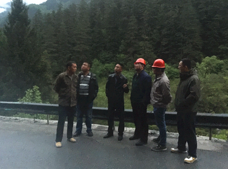 險情發(fā)生后,九寨溝國家級自然保護區(qū)管理局劉春龍局長、業(yè)主代表澤軍、我院九寨溝89處地災(zāi)治理項目部現(xiàn)場總協(xié)調(diào)人陳新、二標(biāo)段執(zhí)行經(jīng)理何海清緊急趕到現(xiàn)場,共同商討對于該危巖的排危方案。