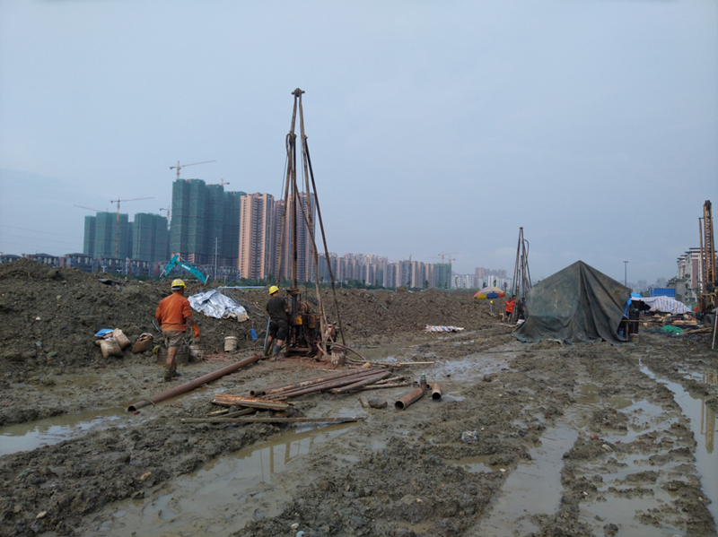 該項(xiàng)目巖土工程勘察原計(jì)劃工期為20個(gè)日歷天,勘探鉆孔782個(gè)、鉆探工作量17118米。開工初期,雖然調(diào)集了30臺(tái)鉆機(jī)進(jìn)場(chǎng),但要滿足建設(shè)單位的工期要求,仍存在很大差距,加之連續(xù)下雨導(dǎo)致場(chǎng)地積水嚴(yán)重且泥濘不堪,勘探進(jìn)度十分緩慢,我院水文地質(zhì)工程公司迅速組織安排專人聯(lián)系成都、重慶、成都周邊地區(qū)的數(shù)十支鉆探隊(duì)伍,鉆機(jī)增至50臺(tái)。