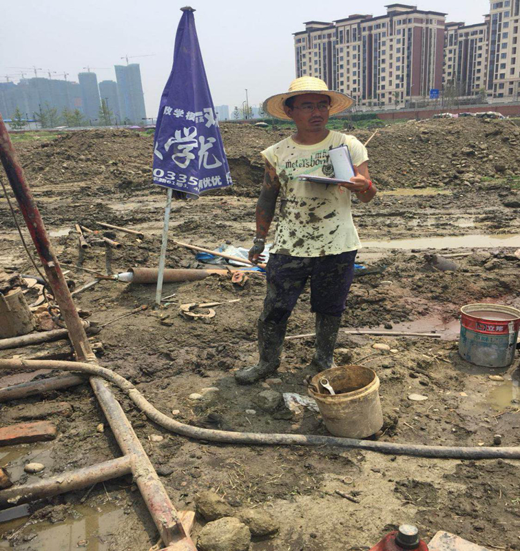 在泥濘場(chǎng)地中安排鉆探生產(chǎn)的項(xiàng)目負(fù)責(zé)人范偉 勘察項(xiàng)目現(xiàn)場(chǎng)實(shí)測(cè)溫度約46度