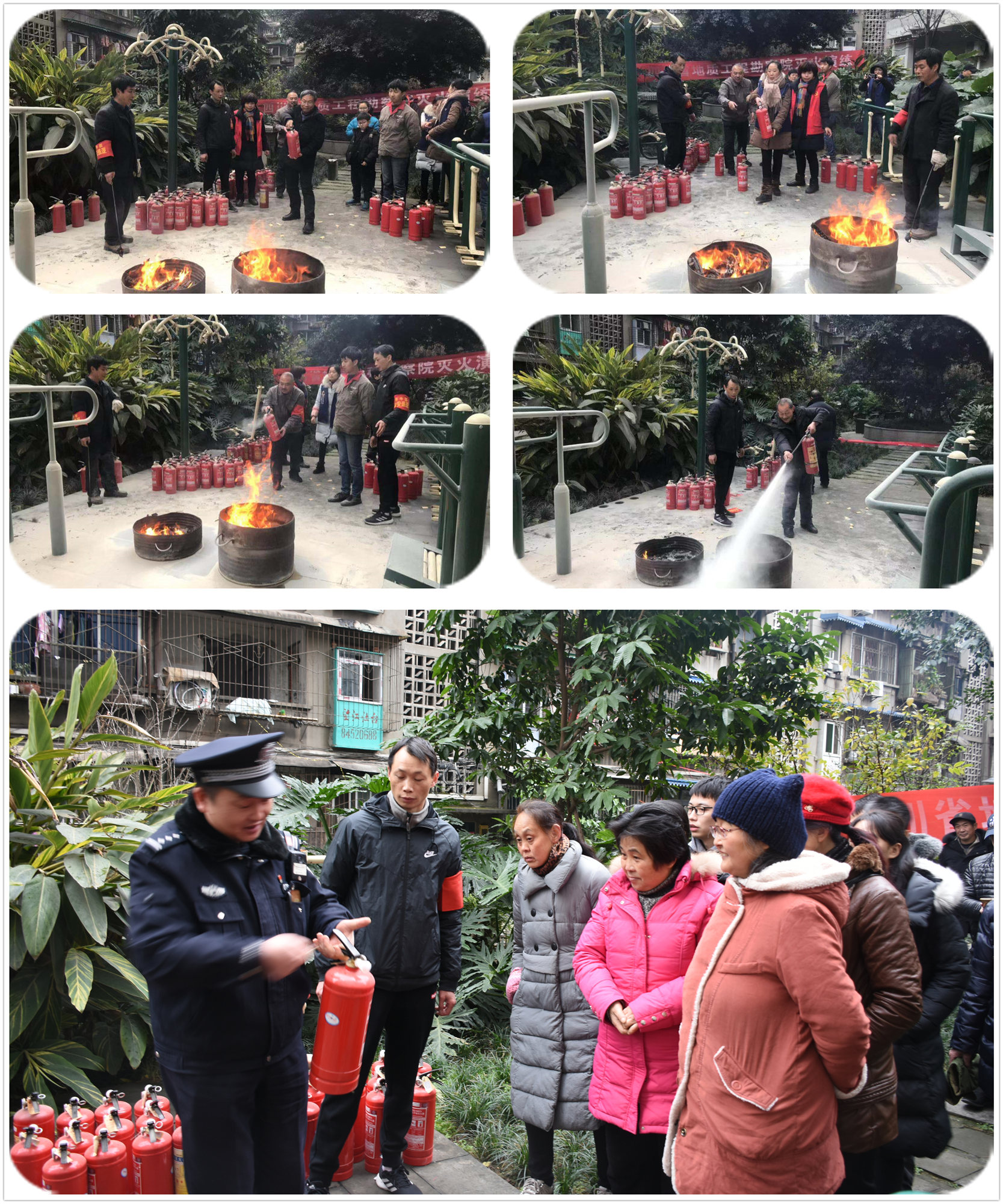 演練工作人員和社區(qū)民警首先給大家講解了滅火器的使用方法及注意事項,隨后在工作人員的指導(dǎo)下,參加演練的60余名干部職工及家屬先后使用滅火器對現(xiàn)場兩處著火點進行實戰(zhàn)滅火。